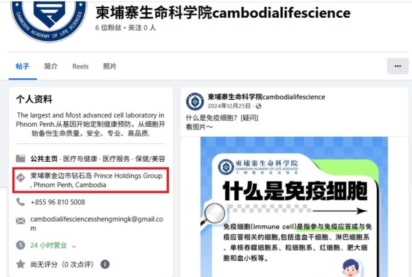 新唐人记者查询发现,柬埔寨生命科学院在大陆抖音等社交平台的宣传中,自称“坐落于首都金边市CBD钻石岛核心区域”,是“柬埔寨首批依据国际标准建设的B+A级别GMP细胞实验室”。而这家机构的脸书页面直接写明,其所在地址就是金边市钻石岛的太子集团(Prince Holding Group)总部。
