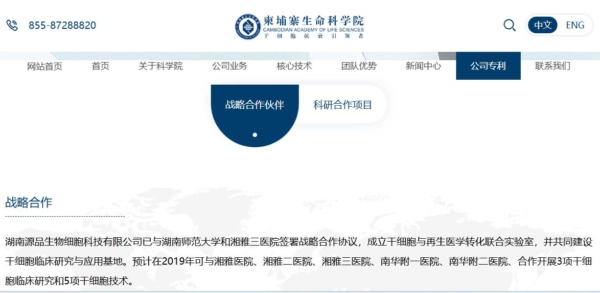 柬埔寨生命科学院的官网还列明,源品生物与湖南师范大学、湘雅医院、湘雅二医院、湘雅三医院、南华附一医院、南华附二医院等多个湖南官方机构合作干细胞或者“再生医学”项目。