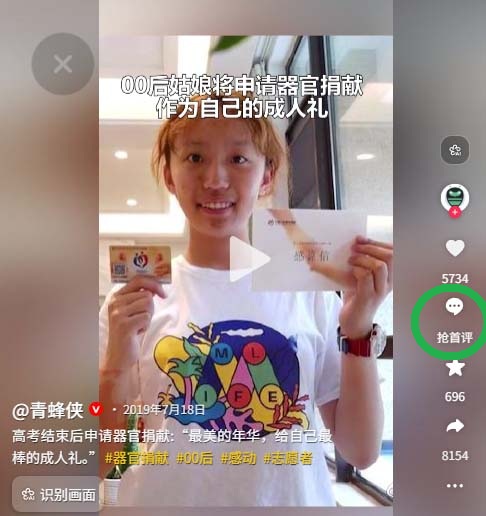 这段视频是在2019年7月18日发布,内容是一名“00后”女大学生将申请器官捐献作为自己的“成人礼”,并大喊“荣耀”。网民近期发现,不但视频中女主角的抖音账号已被注销,在这段视频下留言自称已申请捐献器官的年轻人,也几乎都已被销号。