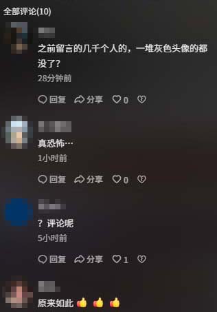 有人留言询问:“之前留言几千个人的,一堆灰色头像的都没了?”有人回答,“都给删了”“真恐怖”“(它们)害怕”“(看它们)怎么篡改历史”。