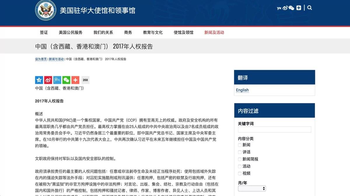 美国驻华大使馆和领事馆官方网站发布了《中国(含西藏、香港和澳门)2017年人权报告》(无需翻墙可以阅读https://china.usembassy-china.org.cn/zh/china-includes-tibet-hong-kong-and-macau-2017-human-rights-report/),美国驻华大使馆微博也进行了转发。至今链接地址并未被屏蔽,仍可以暂时打开,引发网民议论。但绝大多数评论无法正常显示。