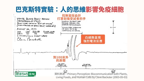 结果,当巴克斯特将这些事件的发生时间点与测试曲线互相对照时,发现曲线上的异常反应几乎和布莱恩所有的焦虑都密切关连,而白细胞所测出的反应曲线在他到家就寝之后,也变得平静了。