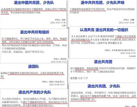 “从铁链女到唐山打人,然后经历疫情封控,到最近于朦胧事件,纵观它七十多年犯下的反人类罪行。本人今天郑重声明退出中共共青团和少先队,脱离这个邪恶的组织。”