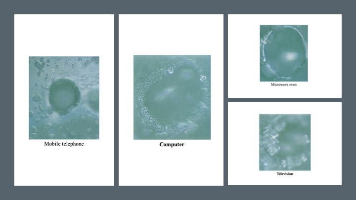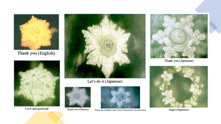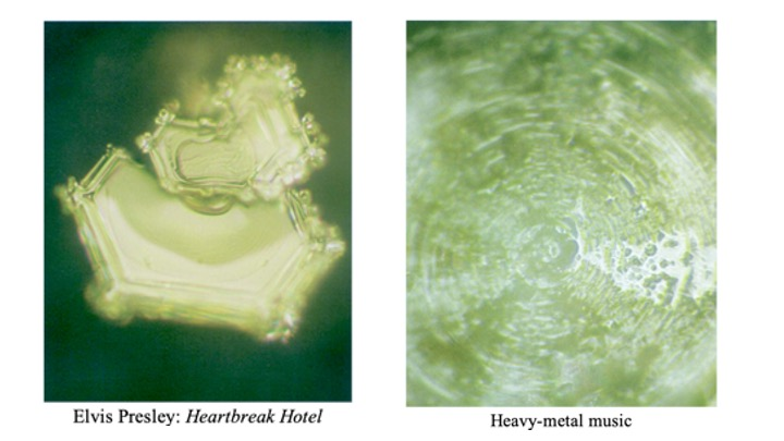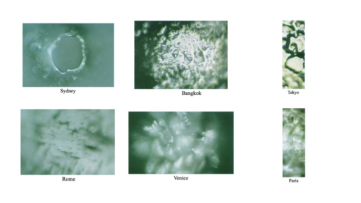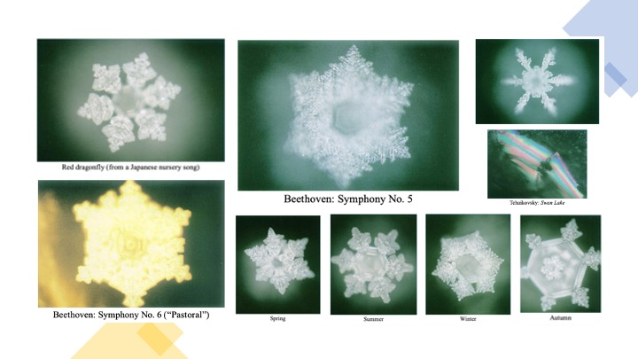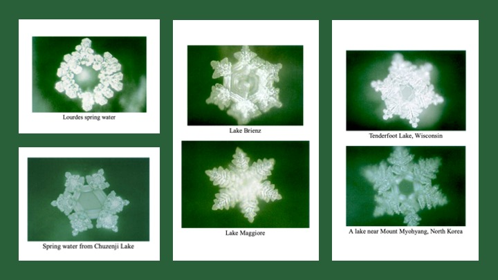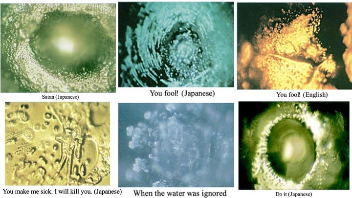 无独有偶,不仅仅是巴克斯特发现植物有精神、能感知,日本的健康、管理和社会服务国际技术教育研究所(Institute for technology-based education in Health, Management and Social Services International, IHM)的科学家江本胜(Masaru Emoto, 1943—2014)⁶¹⁵的研究也发现,现代科学界所认为的无机物──水似乎也具备精神,能感知人和周围环境给它的信息,包括文字、声音、图像、空间环境等等,并在水结晶上反映出来。他的研究成果记录在《水知道答案》(The Hidden Messages in Water)一书中。⁶¹⁶