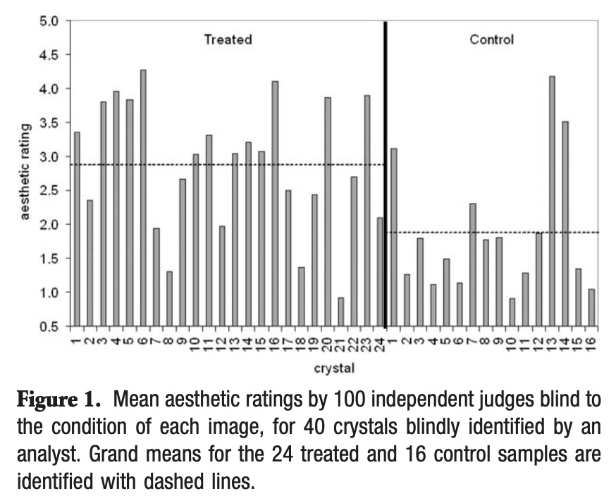 拉丁博士等2008年发表在《科学探索期刊》(Journal of Scientific Exploration)上的三盲实验的论文标题为“远方意图对水晶体形成的影响:三盲重复”(Effects of Distant Intention on Water Crystal Formation: A Triple-Blind Replication)。实验是这样做的,三天内,奥地利和德国的1,900人将注意力集中在加州电磁屏蔽室内的水样本上。提供正面意念信息的人不知道位于目标水附近有一个充当“邻近对照”的水样本。另外,位于屏蔽室外还有一个“远端对照”水样本。技术人员对不同处理条件下的水样本形成的结晶进行拍照,每张图像均由超过2,500名独立评审进行美学评估,并对所得数据进行分析。所有参与者都不清楚照片的分组情况。结果表明,提供正面意念信息处理的水结晶,晶体影像被评价为比邻近对照的水结晶晶体更美观(p=0.03)。这项结果再一次验证了先前江本胜的研究和双盲测试的结果。⁶¹⁹