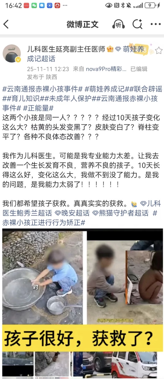 微博一位名为“儿科医生延亮副主任医师”,博主发帖质疑,“这两个孩子是同一个人???经过10天孩子变化这么大?枯黄的头发变黑了?皮肤变白了?脊柱变平了?各种不良体态改善??”