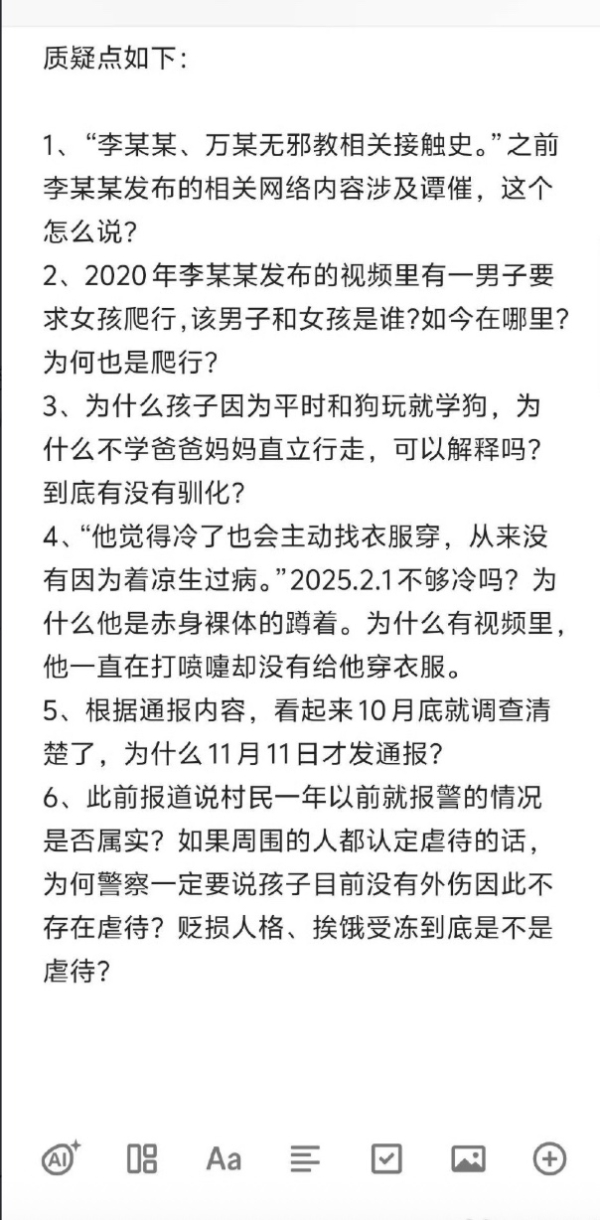 有网友分析该调查的多个矛盾及逻辑漏洞,包括:“文章解释说,因为狗是唯一玩伴,所以他学了狗的生活状态,但又强调父母寸步不离,没解释为什么不学父母的样子?”“训狗指令怎么解释,涂白脸怎么解释,站车顶怎么解释,大冬天的二月份不穿衣服怎么解释,发烧生病时睡水泥地怎么解释,放任他被摩托男嬉戏叫溺爱?服务区厕所门口趴地上啃苹果这些都是溺爱?李某的谭崔图片调查呢,李某微视视频号强迫那个小女孩在地上爬调查呢?仅仅解释因为湿疹不爱穿衣服恐怕避重就轻”。