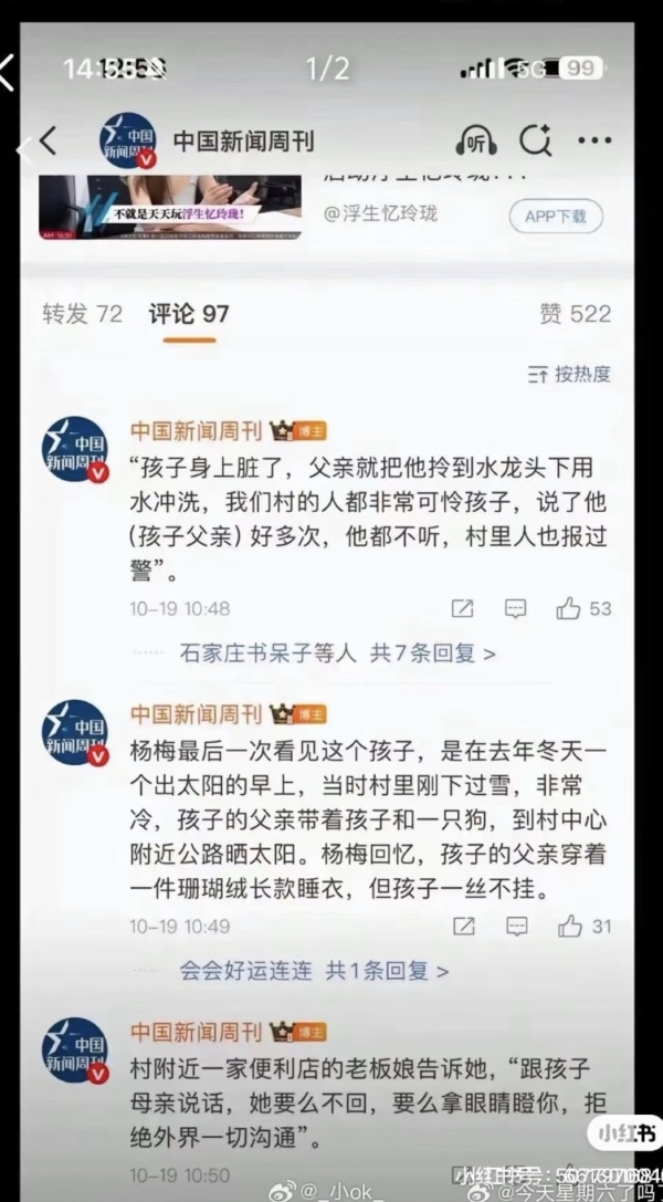 据中共官媒《中国新闻周刊》10月19日报导,据村民说,冬天很冷,孩子父亲拎着孩子到水龙头下冲洗,村民劝说无效,多次报过警,还有一次是在冬天的早上,刚下过雪,孩子父亲穿珊瑚绒长款睡衣,带着孩子和一只狗,孩子“一丝不挂”。