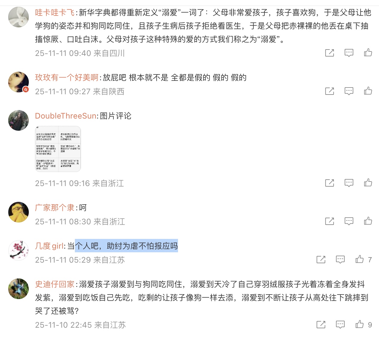 “新华字典都得重新定义‘溺爱’一词了:父母非常爱孩子,孩子喜欢狗,于是父母让他学狗的姿态并和狗同吃同住,且孩子生病后孩子拒绝看医生,于是父母把赤裸裸的他丢在桌下抽搐惊厥、口吐白沫。父母对孩子这种特殊的爱的方式我们称之为‘溺爱’”。