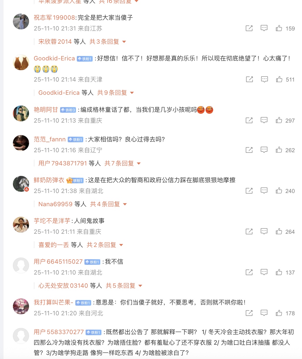 有网友表示,彻底对当局失望,“重塑三观”“信仰崩塌”“之前一切美好原来都是假象”“这是在把大众的智商和政府公信力踩在脚底狠狠地摩擦”“嗯,悬着的心终于死了”。