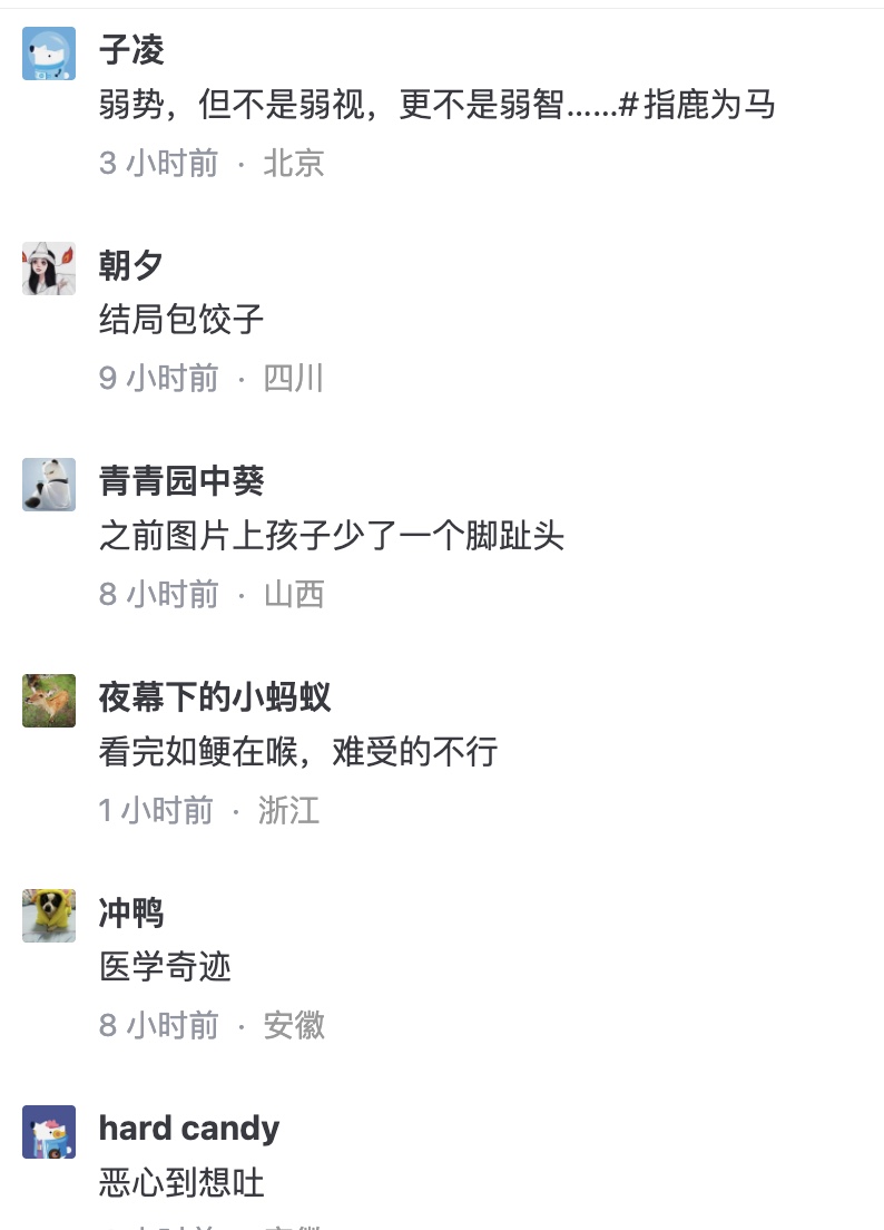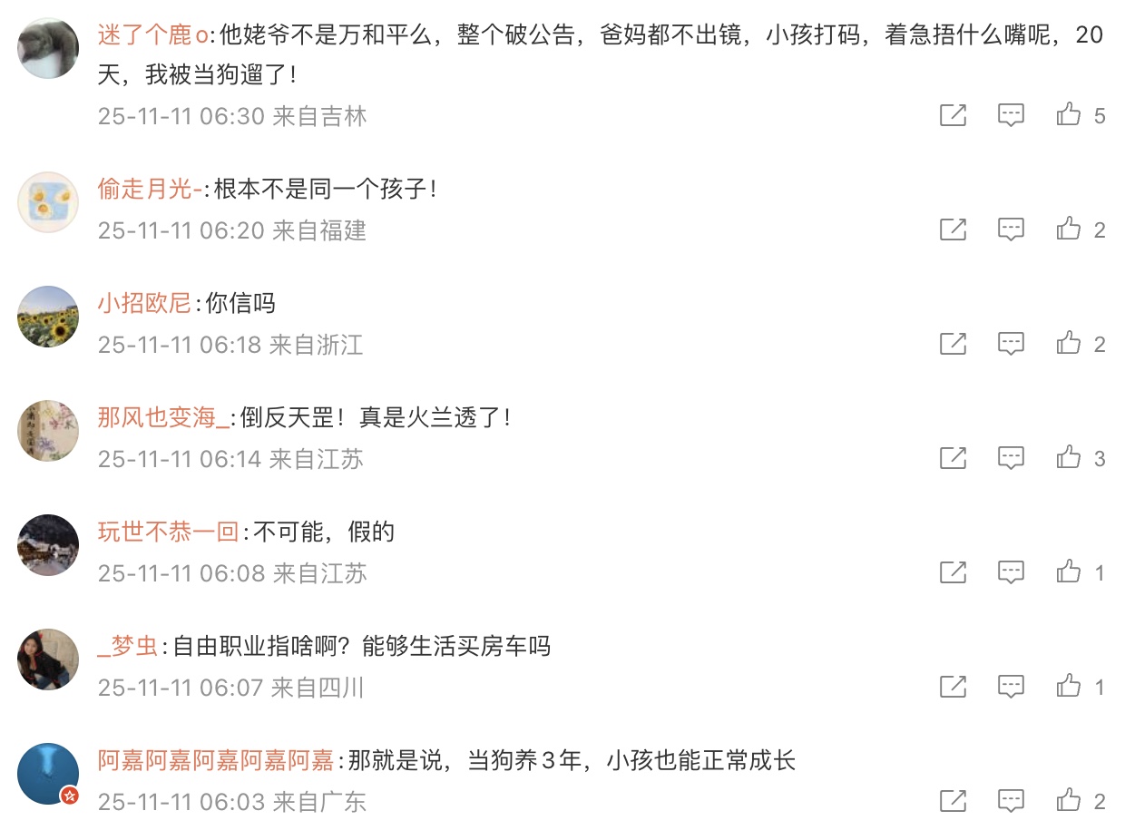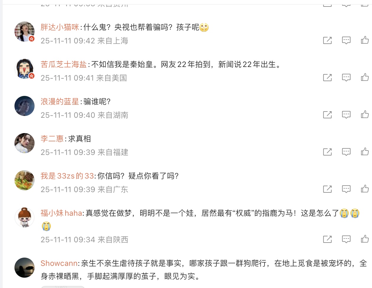 “根本不是一个孩子”“把我们当猴耍呢,我们不瞎, 根本就不是同一个人”“放屁吧,根本就不是,全都是假的,假的 ,假的”“有眼珠子的都知道是假的”“孩子,妈妈,姥爷都不是同一个人”“颠倒黑白,一个字都不信。讲故事哄3岁小孩!”。