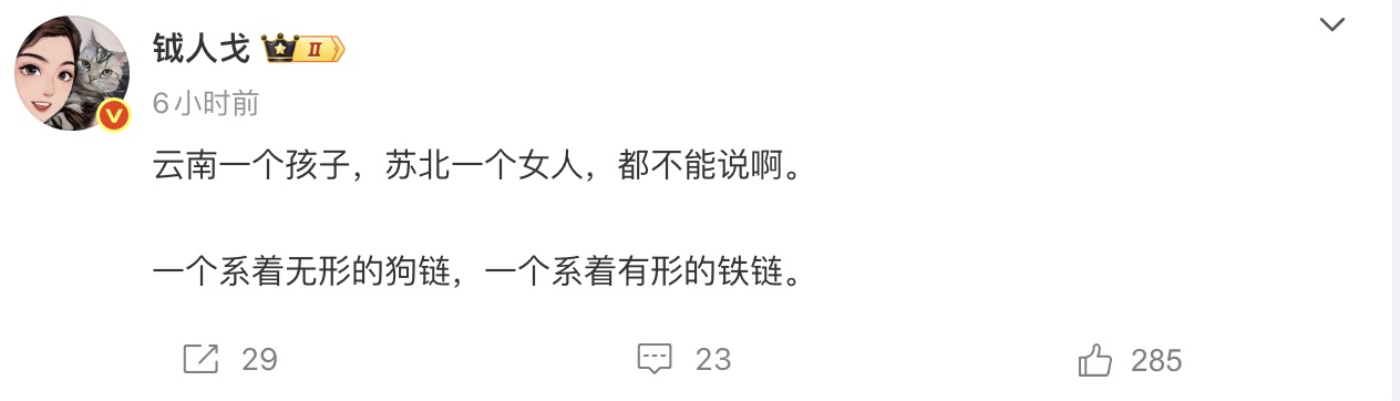 一微博博主发帖比较之前“铁链女”事件和云南“野孩子”事件,说,“云南一个孩子,苏北一个女人,都不能说啊。一个系着无形的狗链,一个系着有形的铁链”。