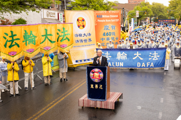 2026年4月25日,大纽约地区部分法轮功学员在法拉盛游行和集会,纪念“四‧二五”和平上访27周年,声援4.6亿中国人退出中共党、团、队。全球退党服务中心主席、追查国际主席汪志远先生发言。(戴兵/大纪元)
